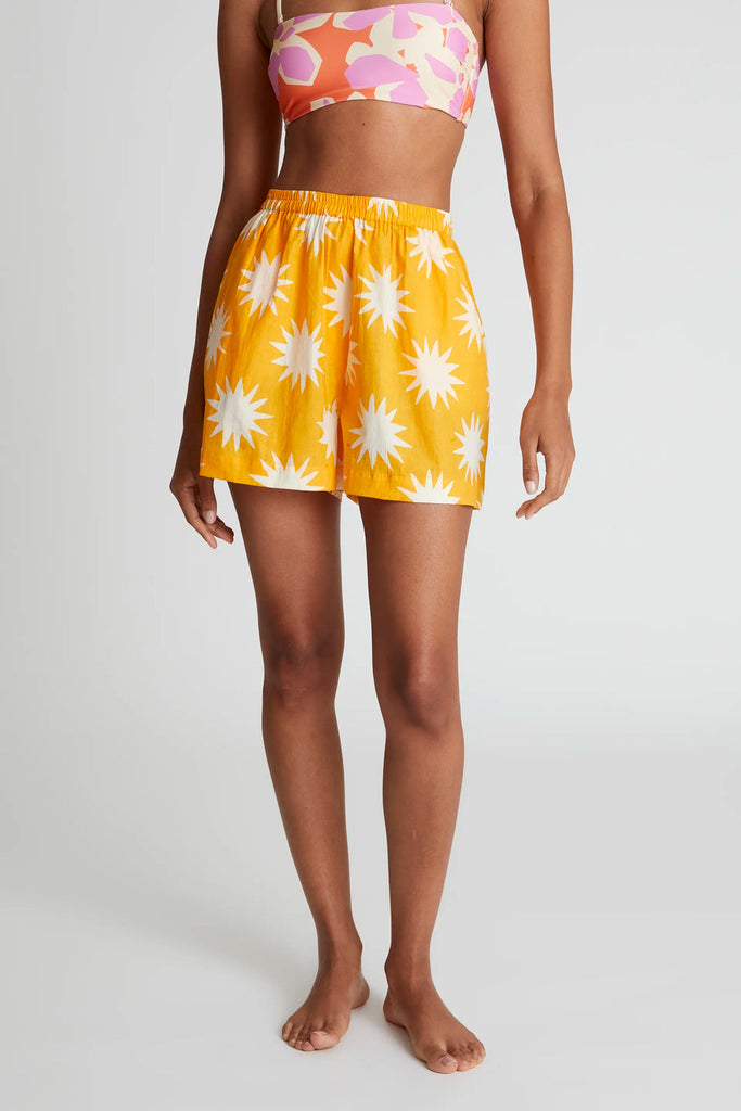 Big Sun print shorts. Mid-rise elastic waistband. Side pockets.