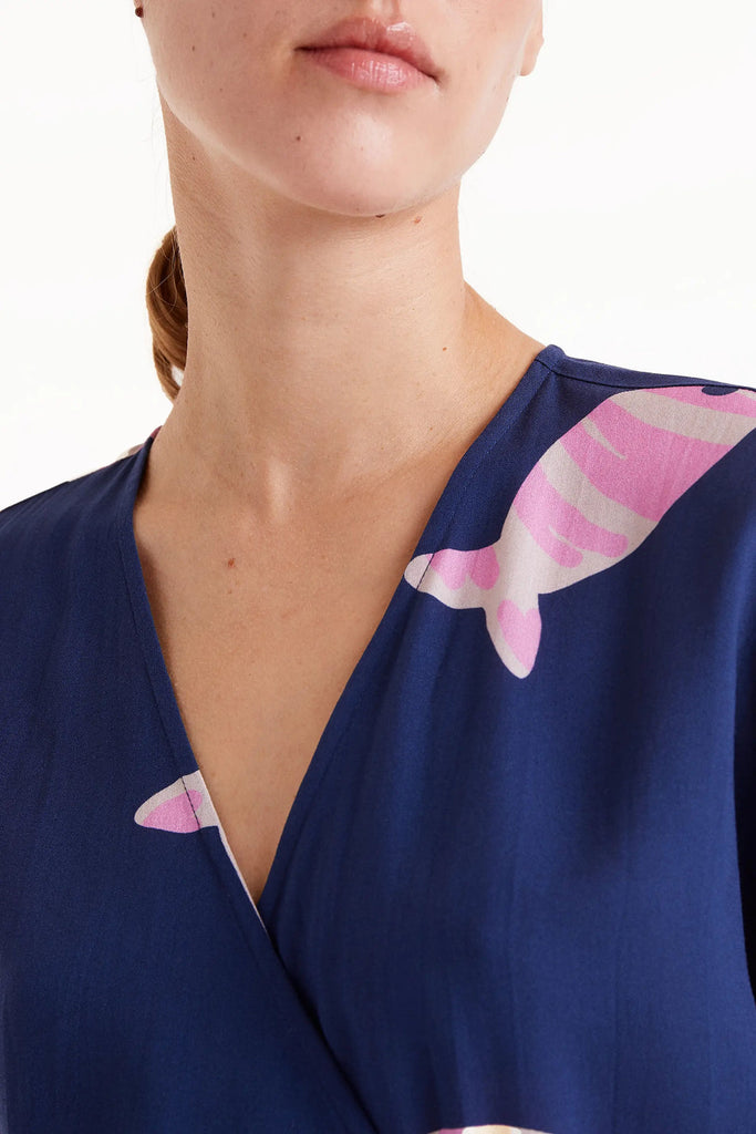 Midi dress in LENZING™ ECOVERO™ rayon with a Pink Fish print. Featuring a V-neck and short, rolled-up sleeves. Wrap style with a side tie.