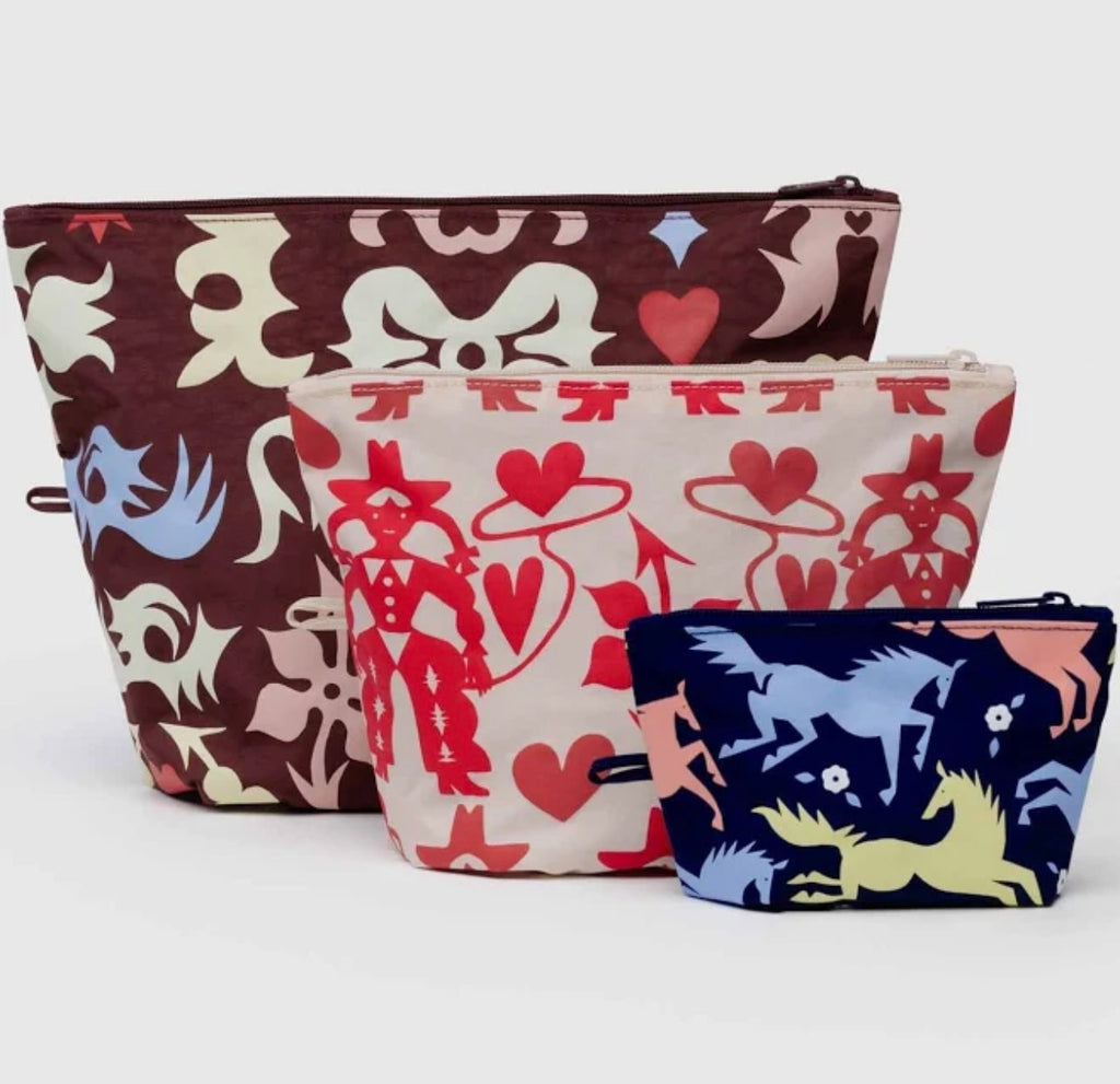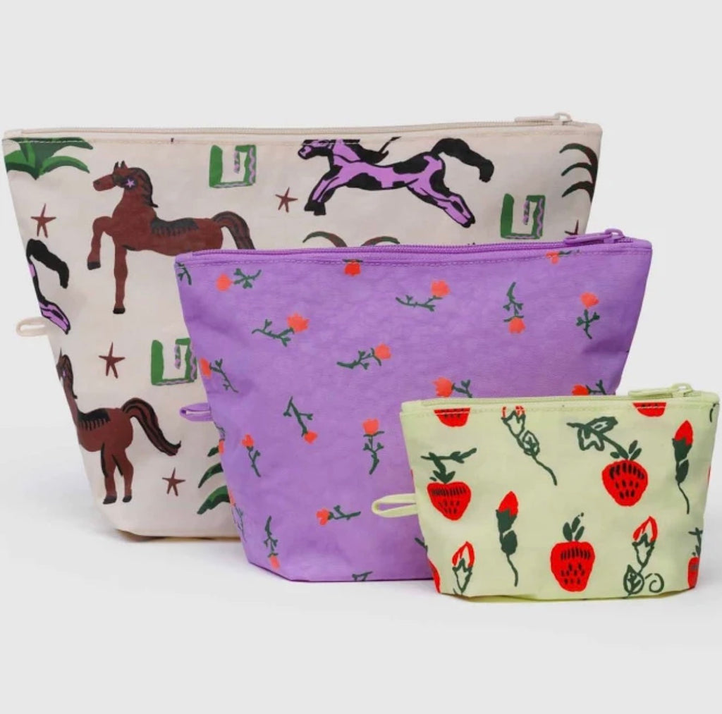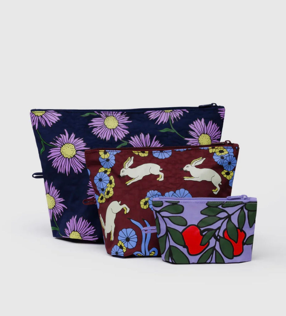 A set of three zippered pouches for travel and organization, with loops for carrying and hanging on the go. Perfect for packing, organizing your bag, or home tidying.