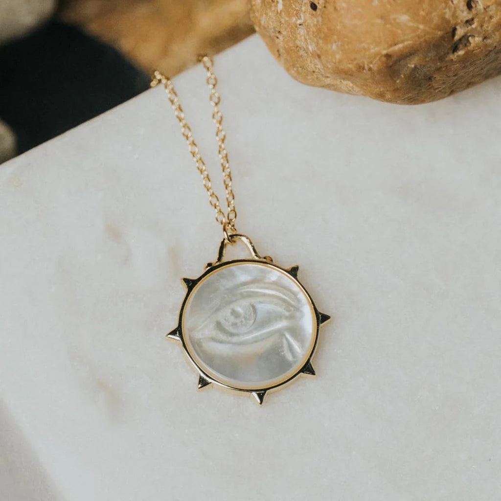 Lovers Eye Necklace features an 18K gold-plated 925 sterling silver chain and a 2 cm pendant. The pendant showcases an engraved "Lover's Eye" on a shell, accented with a dangling pearl. The chain length is adjustable 16" -18" This piece combines elegance and artistry for a striking accessory.