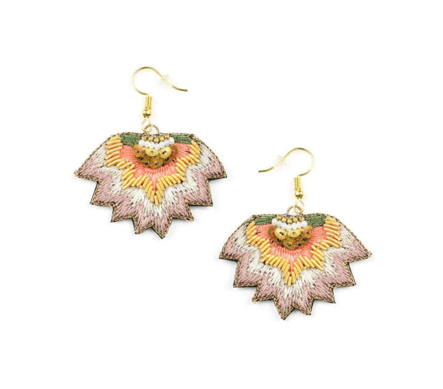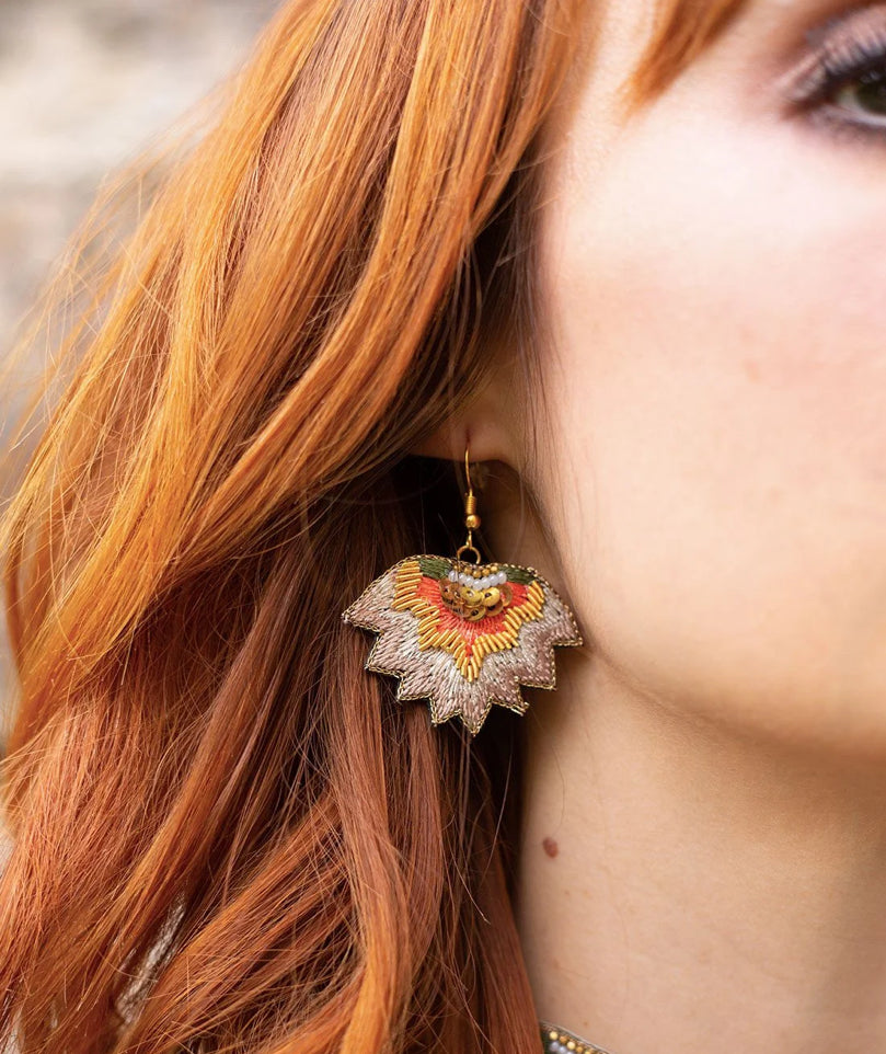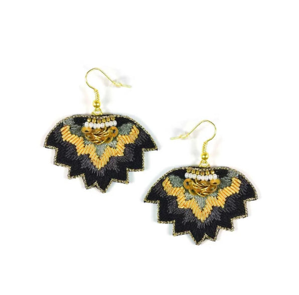 Earrings hand-embroidered with silk thread, sequins, brass beads and Japanese pearls. Soft leather lining, stainless steel and anti-allergenic brass hooks.