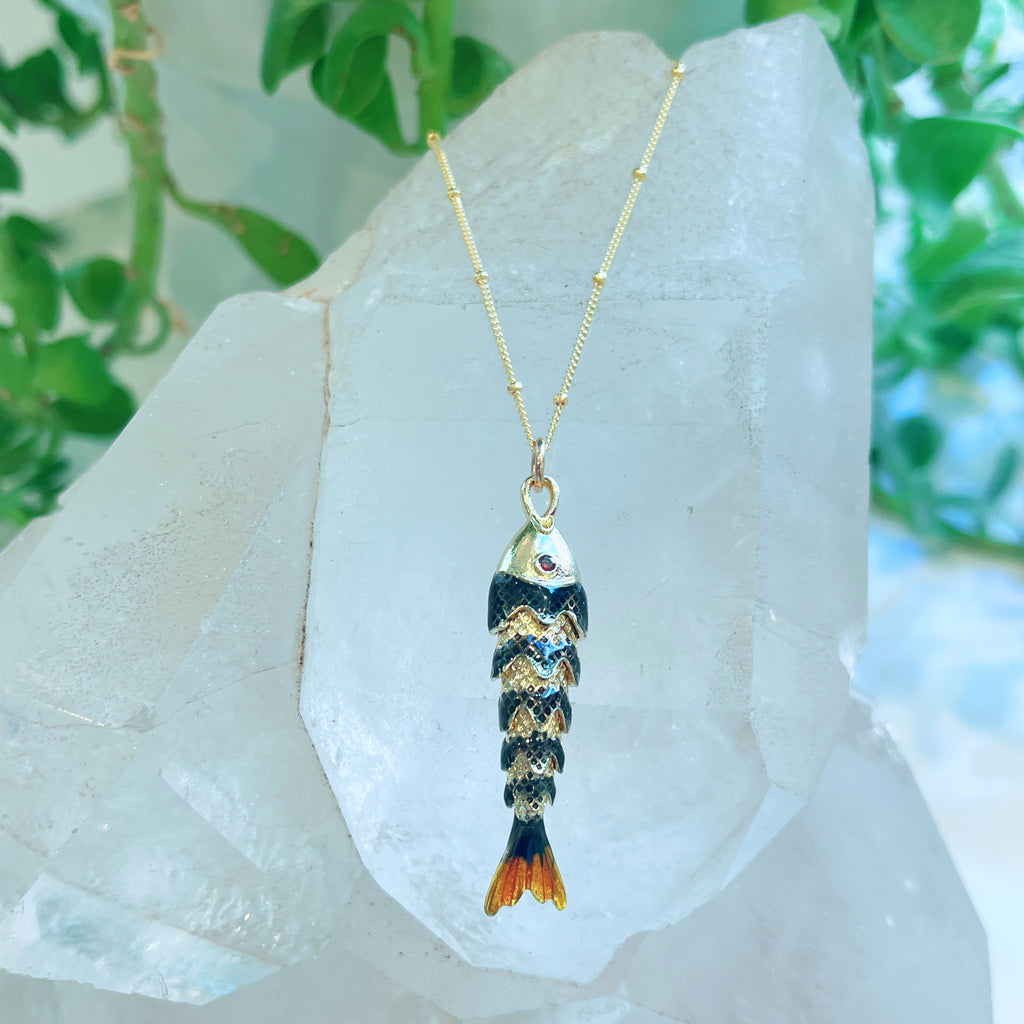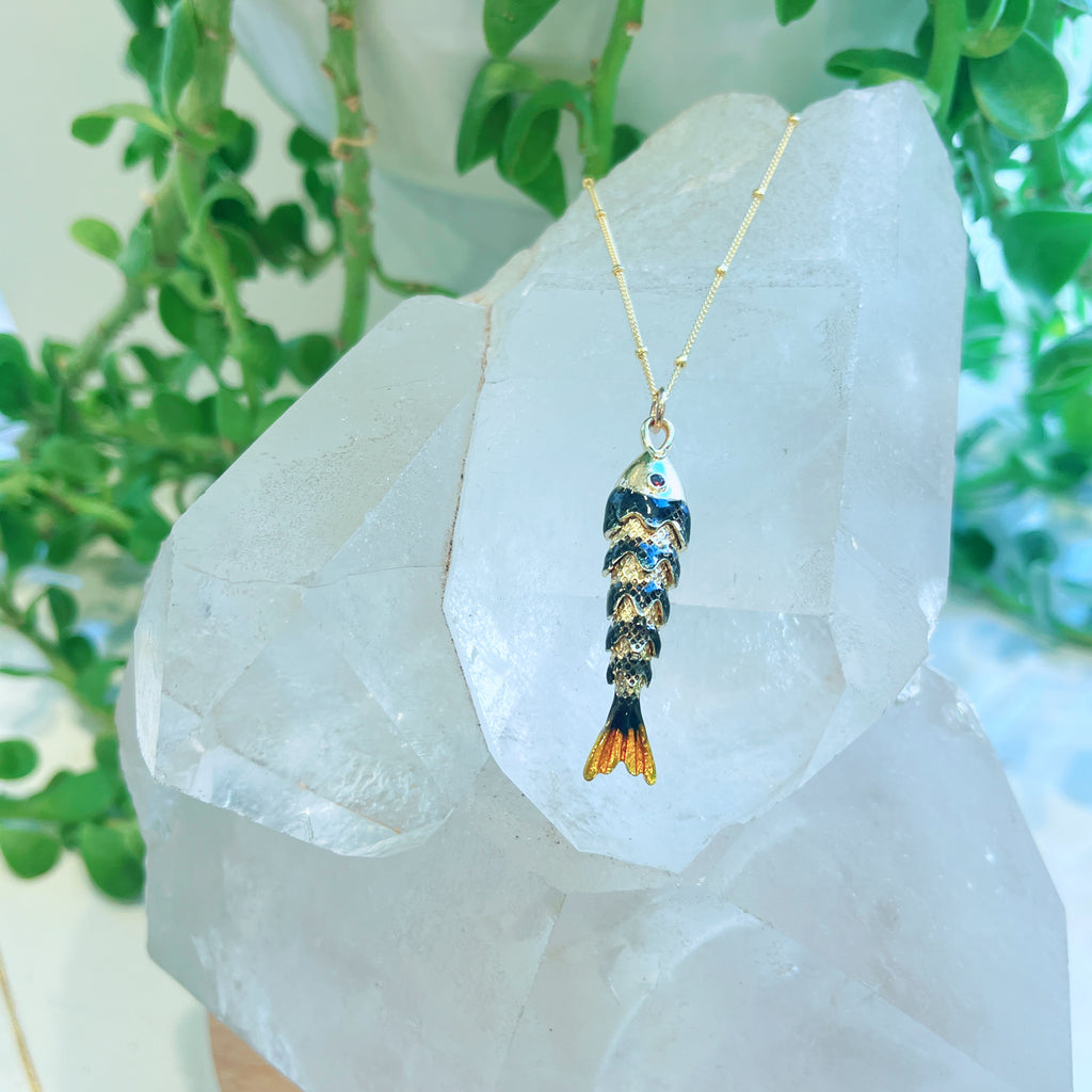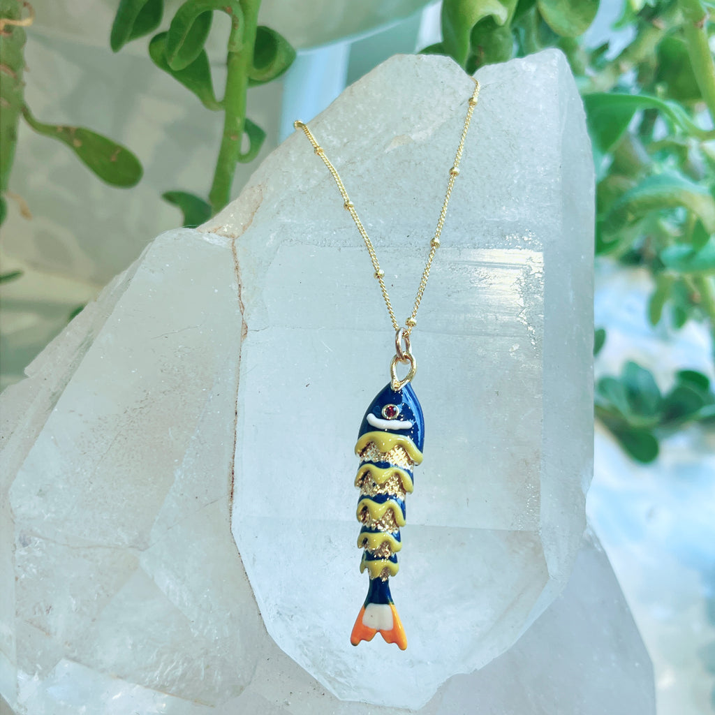 Golden Fish Necklace $95.00 Variants Long Golden w/ Green Eyes - $95.00 Light Blue Enamel - $85.00 Dark Blue Enamel - $85.00 Red Enamel - $95.00 Small Golden w/Amazonite - $110.00 Black Enamel - $95.00 Large Golden Fish - $95.00 Quantity Add to Cart This item is a recurring or deferred purchase. By continuing, I agree to the cancellation policy and authorize you to charge my payment method at the prices, frequency and dates listed on this page until my order is fulfilled or I cancel, if permitted. This variant is currently sold out Please fill in the form below if you'd like to be notified when it becomes available. Your Email Handcrafted in 14K Gold Vermeil