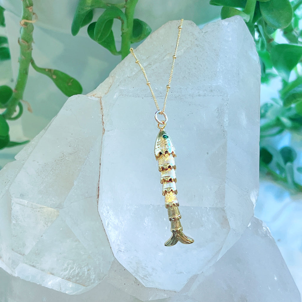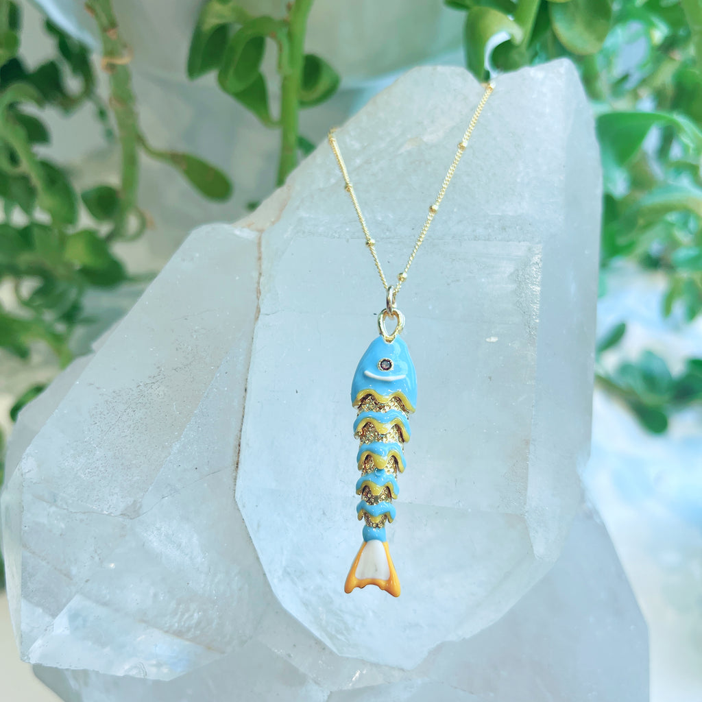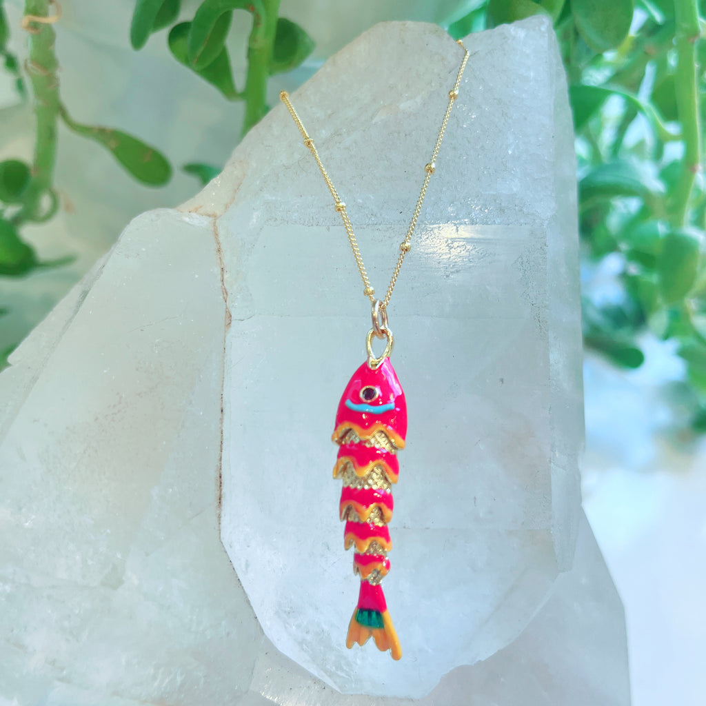 Golden Fish Necklace $95.00 Variants Long Golden w/ Green Eyes - $95.00 Light Blue Enamel - $85.00 Dark Blue Enamel - $85.00 Red Enamel - $95.00 Small Golden w/Amazonite - $110.00 Black Enamel - $95.00 Large Golden Fish - $95.00 Quantity Add to Cart This item is a recurring or deferred purchase. By continuing, I agree to the cancellation policy and authorize you to charge my payment method at the prices, frequency and dates listed on this page until my order is fulfilled or I cancel, if permitted. This variant is currently sold out Please fill in the form below if you'd like to be notified when it becomes available. Your Email Handcrafted in 14K Gold Vermeil
